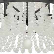 Add a touch of modern style to your décor with the Bella frosted glass bead chandelier. The metal frame features glass beads sweeping downward and inward, connecting a larger hanging glass ball. This elegant contrast of Matte Black or Antique Gold combined with frosted white glass adds a bold look to your indoor living areas.