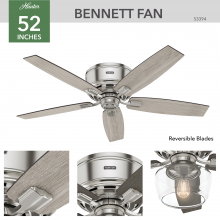 Hunter 52 inch Bennett Brushed Nickel Low Profile Ceiling Fan with LED Light Kit and Handheld Remote (53394)