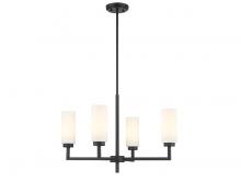 Get glowing with this angular, stylish 4-light chandelier. Each arm is finished in Matte Black and holds a tall, sleek cylinder of white opal glass for bright yet flattering light. This chandelier is 26" in width and has an adjustable height ranging from 17" to 71". It comes with four 12" downrods and one 6" downrod. Uses 4 candelabra size bulbs of up to 60 watts per bulb. Bulbs not included.
