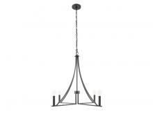 This intriguing 4-light chandelier features a unique silhouette that rethinks the typical structure of a chandelier! Its sleek arms curve gracefully and are finished in Matte Black. It is 27" in height and 30" in width. Uses four candelabra size bulbs of up to 60 watts per bulb. Bulbs not included.