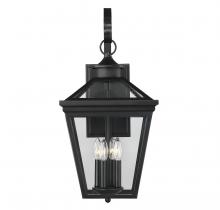 Brighten the exterior of your home and welcome your guests in style with the Savoy House Ellijay 4-light outdoor wall lantern. The design mimics a vintage gas lantern with a classic tapered box shape and decorative top finial. The black finish looks terrific and blends well with other hardware and architectural materials. Panes of clear glass fill all four side panels and the roof panels, too. Four 40W candelabra size bulbs provide inviting and secure illumination. This lantern measures 12" wide, 25.5" high and extends 15" from the wall. You’ll enjoy its timeless style and enhance the beauty of your property, whether on your porch, patio, sunroom, pergola or other outdoor walls in your garden and yard.