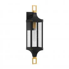 Featuring a handsomely constructed look that recalls designer jewelry, the Savoy House Glendale 1-light outdoor wall lantern effortlessly emboldens any outdoor space. Buckle and screw detailing is finished in Weathered Brushed Brass to contrast beautifully with the Matte Black finish. Clear seeded glass adds texture and drama. Glendale is 28" in height, 6.5" in width and extends 8" from the wall. Uses one standard size bulb of up to 60 watts. The bulb is not included. Wet area rated.