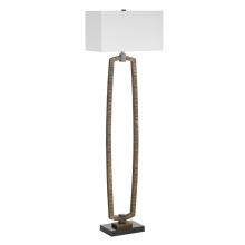 The Relic Floor Lamp Captures Bohemian Charm With Its Deeply Antiqued Gold Finish With Hand-carved Textures Along The Unique Parallel-style Base. It Is Complemented By Dark Bronze Accents And A Black Marble Foot. The Lamp Is Paired With An Oval Hardback White Linen Shade.