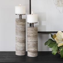 Illuminate Your Space With Sophistication Using These Cylinders Of Unfilled Gray Travertine Featuring Dark Bronze Metal Candle Cups. Crafted For Elegance And Durability, These Candleholders Add A Touch Of Refined Ambiance To Any Room. Since It Is A Natural Stone, Each Piece Of Travertine Is Unique. Two 4"x3" White Candles Included. Sizes: S-4x13x4, L-4x16x4