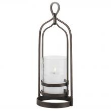 Taking Cues From Moroccan Style, This Candleholder is Finished in Dark Bronze with Gold Rub-through Details and A Textured Glass Hurricane. One White 3"x 3" Candle is Included.