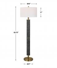This Floor Lamp Features An Organically Carved Design in A Rustic Gray-black with Solid Iron Details Finished in Plated Antique Brass. The Lamp is Paired with A Hardback Drum Shade in A White Linen Fabric.