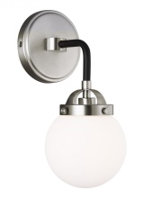 The Cafe one light vanity fixture in brushed nickel provides abundant light for your bath vanity, while adding a layer of today's style to your interior design. Â Handsome two-tone finish and white glass globe shades.