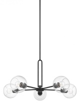 The Codyn five light single tier chandelier in Midnight Black is a contemporary take on a classic mid-century design. Clear glass shades with open-ended spheres accent the elongated keyhole strap detail, for a clean look. This minimalist collection relies on subtle details to create visual interest