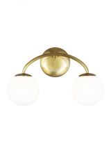 The Galassia two light wall sconce by AERIN in burnished brass perfectly balances a glass globe and curving teardrop frame, giving it a contemporary look. The white glass casts a soft, welcoming glow over a space. This piece works particularly well in a hallway.