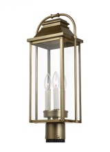 The Sean Lavin Wellsworth three light outdoor post top in painted distressed brass creates a warm and inviting welcome presentation for your home's exterior. A subtle interplay of traditional design elements and nautical influences creates the charming visual approach to the Wellsworth outdoor collection by Visual Comfort Studio. Available in three finishes and two different aesthetics. Antique Bronze finish paired with Clear Seeded glass creates a more traditional look to these outdoor light fixtures; while Burnished Brass and Painted Brushed Steel finish coupled with Clear glass reflects a more contemporary approach. The Wellsworth collection includes a 3-light outdoor pendant, a 3-light outdoor post lantern, and 3-light small and medium outdoor lanterns, as well as a 4-light large outdoor lantern. Cast aluminum construction ensures durability. Wet Rated.